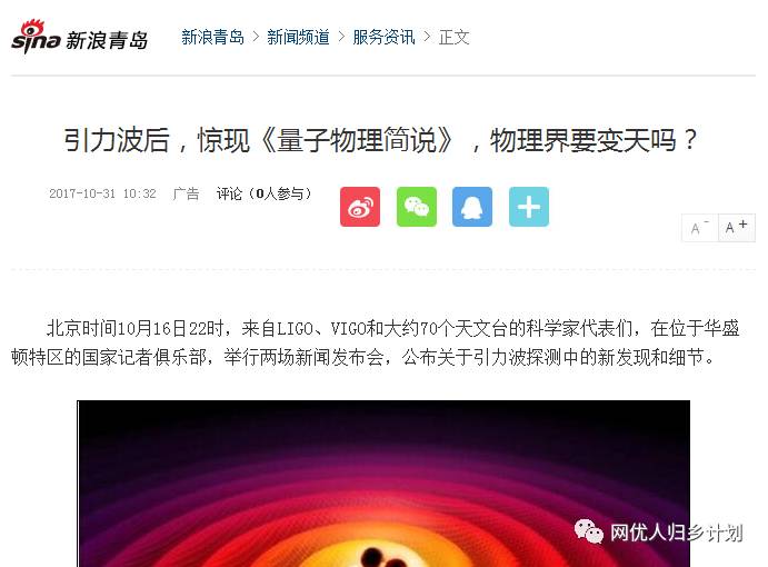 几乎在同一时间,中国网、新浪等大媒体刊发了这样一条新闻:引力波后,惊现《量子物理简说》,物理界要变天吗?