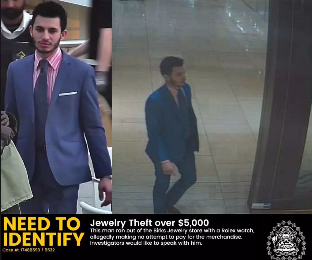 在卡城Downtown的Core购物中心里,大约下午4:40分左右,一个西装革履的年轻男子,走进了购物中心里的一家劳力士手表店,跟服务员说要看一下手表,然后选中了一块价值4.3万加币的高端表,说要试戴一下,服务员就给他戴上了。