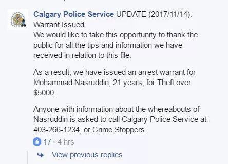 这个偷表年轻人,是21岁的Mohammad Nasruddin,身高175cm,目前居住在卡尔加里,之前可能跟多伦多有关联。