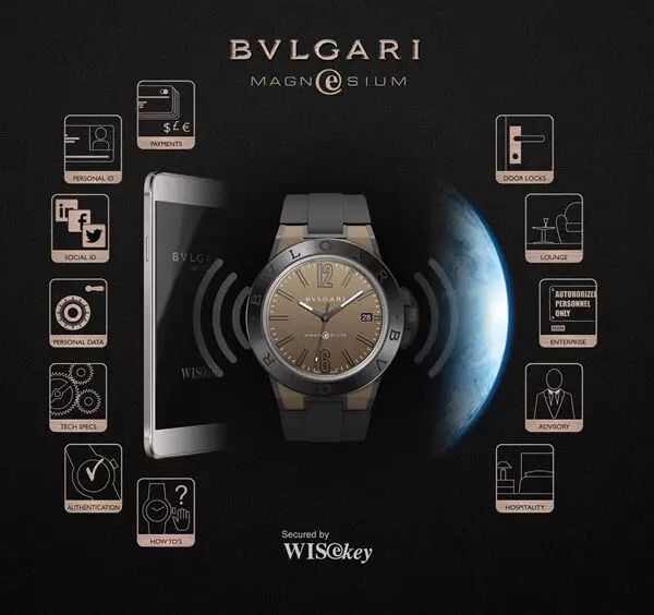 Diagono Magnesium系列腕表配置了加密芯片和隐形天线,运用NFC(近场通信)技术将腕表的数字证书传输至手机,手机需下载并安装宝格丽“金库”应用程序(iOS和Android系统均适用);且该隐形天线置于两层绝缘材料中,因而可避免信息传输干扰。