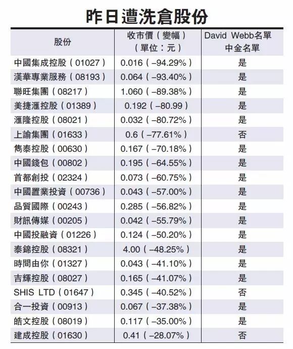 2.本港股市爆發細價股洗倉潮。17家公司股價跌幅超過四成,市值蒸發近500億元。
