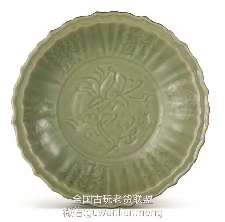 元/明初 龙泉青釉莲纹折沿盘(10-15万)