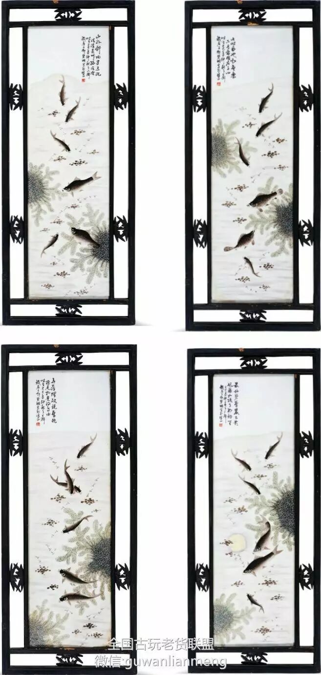 民国 邓碧珊粉彩群鱼图四条屏(90-120万)