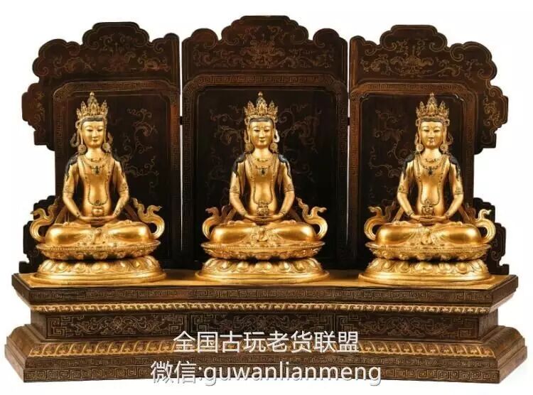 清乾隆 楠木阁楼式佛龛及鎏金铜无量寿佛三尊(300-400万)
