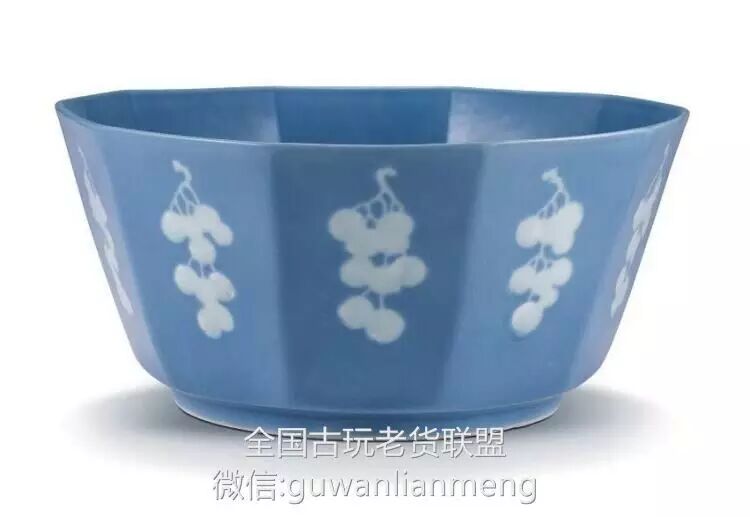 清雍正 天蓝釉留白葡萄纹十棱碗(8-12万)