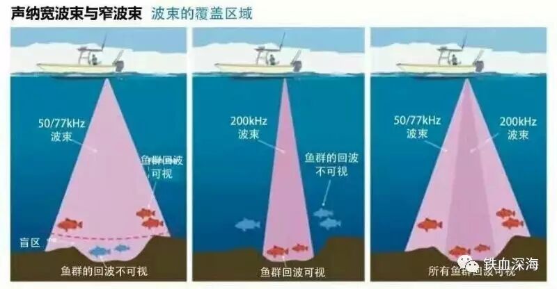 一般传统的探鱼器发射的都是单波束,相对来说还是比较简单的,波束是一个上小下大的圆锥形,在这个锥面的范围内所有的被照射的物体都会反馈形成回波,一般的探鱼器,都会设置2-3个发射工作频率,比如我们常用的77KHZ和200KHZ。每个频率下的波束锥角都有所不同,如下图示:![]()