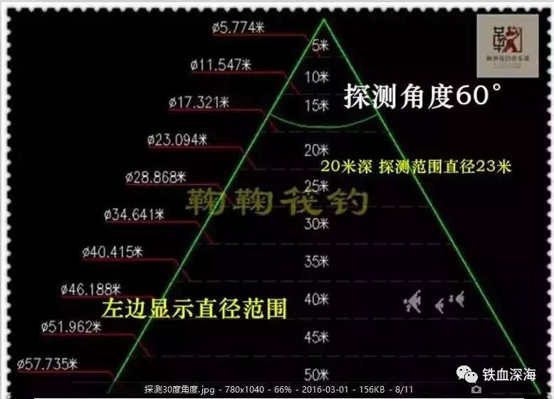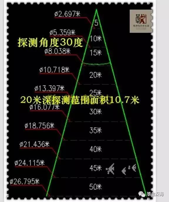 图示中大家可以清晰地看到两种频率的照射面积是不同的,下面给出一个不同频率和角度照射深度和直径的关系表,在实际使用中不断体会,就会形成一个二维空间的概念,图示: