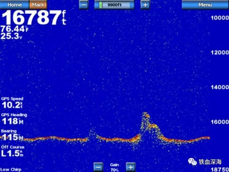 这是一个实际使用中探鱼器的回波画面,深度换算成公制大概是5000米,这样一个深度任何光波和电磁波在水中都是无法企及的。所以,声波在水底或水中的探测就顺理成章地成为非常好的媒介。