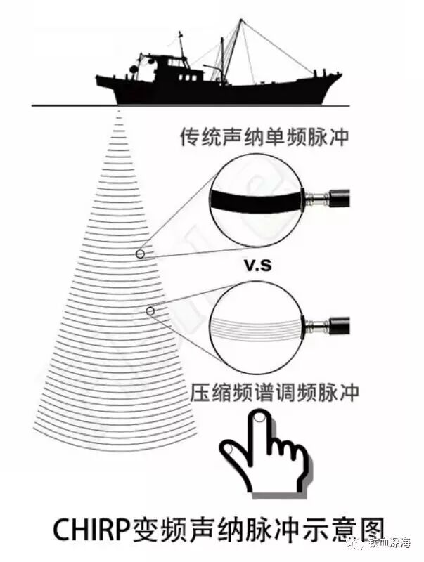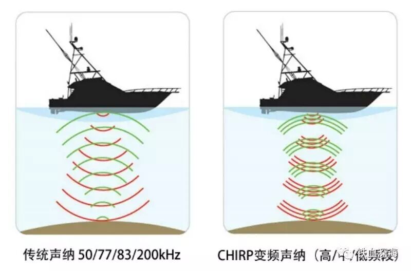 下面来谈谈关于CHIRP探头和传统探头的不同,CHIRP是最近探鱼器界一个很火爆的名词,但它的原理是什么呢?我们以200KHZ的工作频率为基准来说明问题。![]()