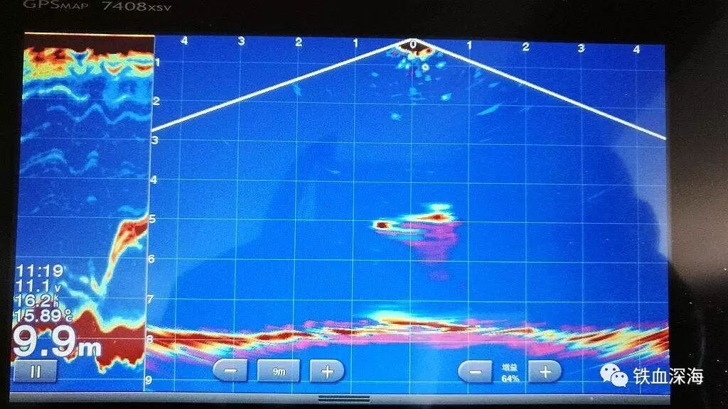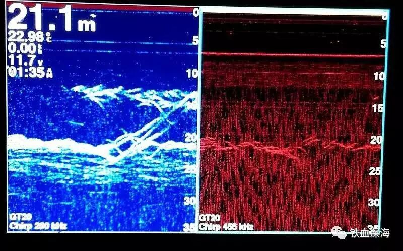 其实很多探鱼器的原理设计,并非是为筏钓设计(国外基本没有筏钓),但如何使用到筏钓上来,却是钓友的聪明才智。短短的一年不到,记得我大概是国内钓友第一个使用动态探头者,当时的初衷是想观察海底石斑冲上来吃螃蟹的实时画面,结果由于在海上的操作环境不适合(水流和波浪起伏太大)而作罢。但有时是无意插柳柳成荫,实时动态探头在短短的半年多时间里面已经被过百的筏钓钓友接受和使用,并且有非常好的实战效果。鞠鞠筏钓的鞠国平先生是这批使用者里面的推广者和使用经验最深者,如此,也必须从实时动态的一些实战显示画面和原理来说明这个问题,对比图:![]()
