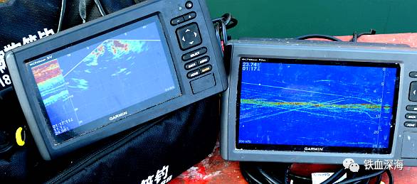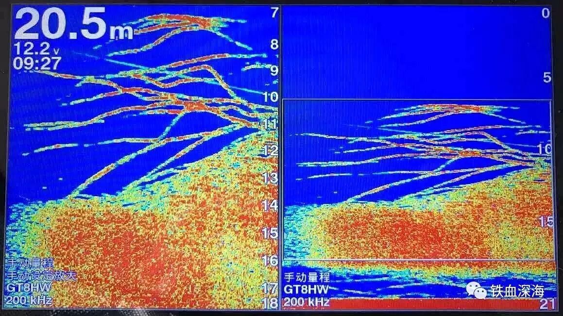 筏钓,是探鱼器使用的一个极为特殊的场合,我们来看下面两个图的对比: