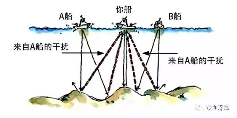 最后,说一下关于干扰的问题,在不大的鱼排上进行垂钓,几台探鱼器互相有同频干扰在所难免,如图:![]()