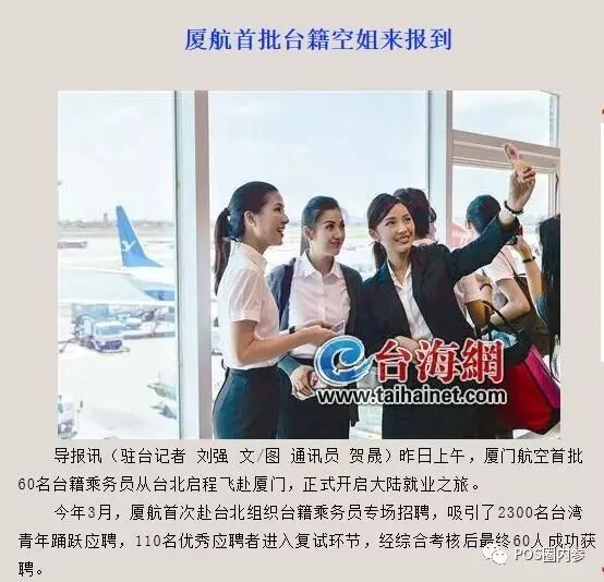 前几天,厦门晚报大篇幅报道台籍空姐到厦门航空上班。报道如下图: