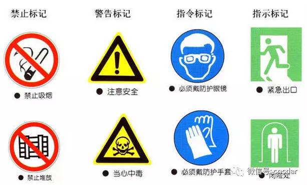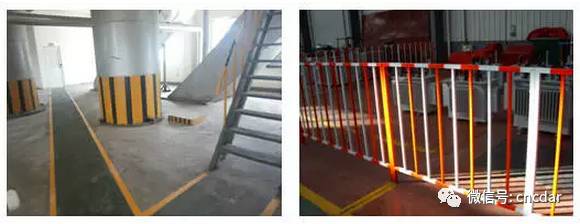 护栏、楼梯扶手常用黄黑相间颜色,大门推拉区域、消防器材前、电气柜前,常用黄黑班马线警示标识。电气警示标识、交通标识,常用红白警示。