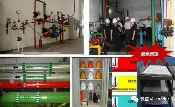 为突出工艺要点,常用色彩突出按钮、开关、加油点等关键点,提高操作效率。对不同管道有规定的颜色标识,以快速识别。