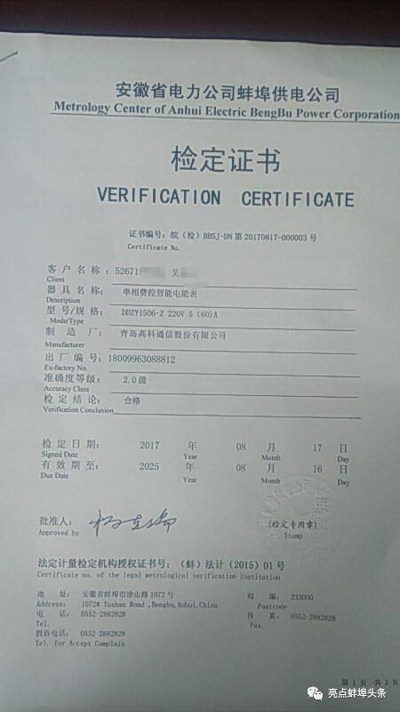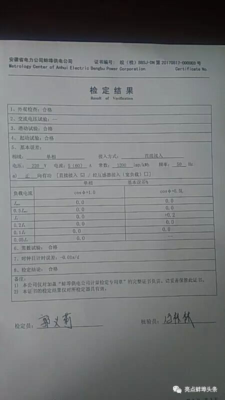 该户于2017年8月17日15:05分校验,依据计量鉴定规程JJG596-2012《电子式交流电能表》,对电表12负荷点进行了校验全部合格,具体见该户《鉴定证书》。