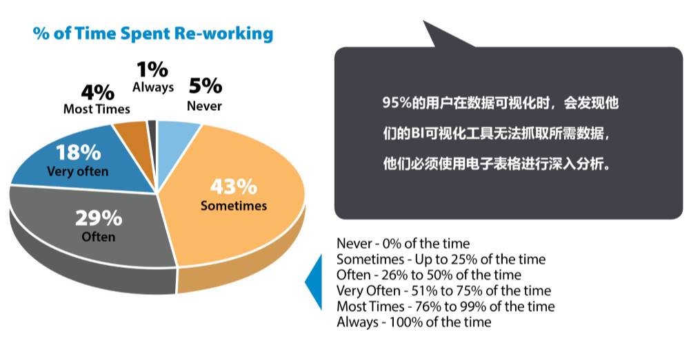 95%的用户在数据可视化时,发现他们的BI可视化工具无法抓取所需数据,他们必须使用电子表格进行深入分析。