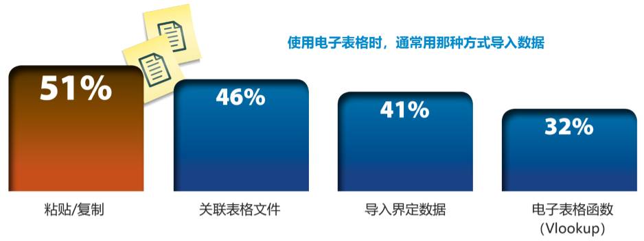 虽然还有众多受访者使用电子表格文件链接(46%)、导入界定数据(41%)、vlookup等电子表格函数(32%)将数据导入。但当文件被移动、删除,或覆盖时,多个电子表格间的文件链接很容易被破坏,而且一个文件中的更改,会对多个关联的文件数据产生错误,。