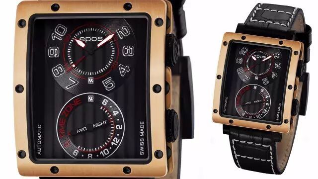 镀金的表壳与大气方形黑色的表盘搭配显示低调又时尚,而这款腕表的秘密和特别之处就在表盘当中了,上面的大表盘就是我们平时看到的时间,阿拉伯数字搭配红色小秒针。