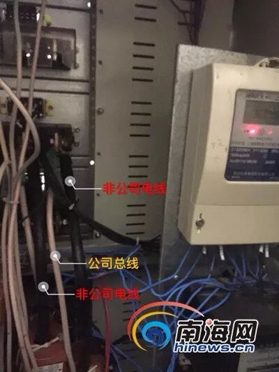 海口公司员工与物业抄读电表时发现电表上多出了两根线,图为疑似增加的线。海金公司供图