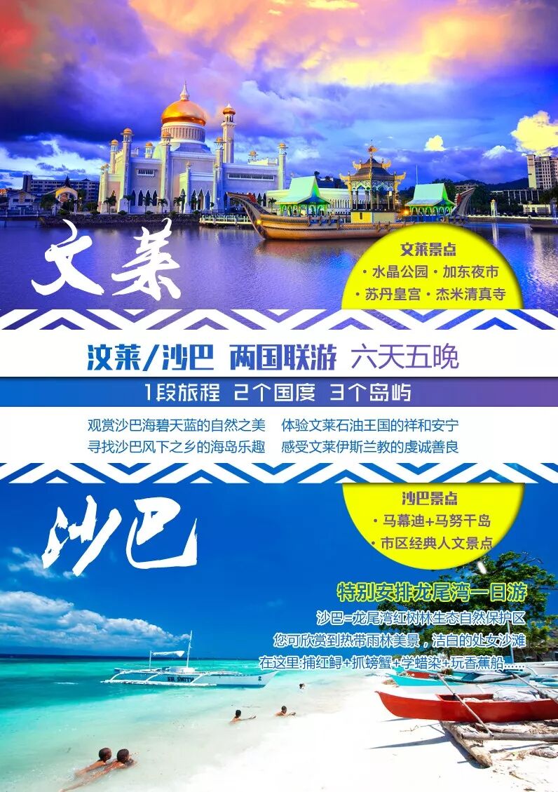 【行程特色】 一次出行,两国联游 悠游“和平之邦”“亚洲首富”石油王国文莱; 参观世界最大水上村落,品尝马来糕点; 感受伊斯兰教的虔诚和汶莱皇室的奢华; 沙巴国家公园双岛游—马穆迪+马努干岛; 人气景点龙尾湾合家欢一日游; 沙巴升级入住4晚市区豪华四星凯城海景房。 |