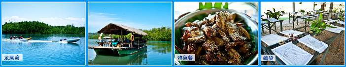 午餐安排享用马来风味特色餐,让您体验东南亚的特色餐食,餐后喜欢水上活动的朋友可以选择以下免费活动:穿上救生衣去玩刺激的香蕉船,刺激万分的冲浪板,考验您平衡和技术的独木舟,一边欣赏大自然的优美风景。不喜欢水上活动的朋友您可以选择参加蜡染制作,亲手做一个蜡染的织品作为留念。休息一会,享用精心安排的马来风味下午茶,甜美的马来糕点及拉茶,更让您享受南洋生活的悠哉!您还可以学习自己烹调马来西亚咖喱鸡,让您将马来西亚的特有煮法带回国内!在龙尾湾的另一边,您可以在沙滩上戏水或体验在沙滩上滑沙的感受,累了您可以在树林间照张舒适的吊床,小憩一下渡过悠闲得午后时光,此地让您回味无穷,乐不思蜀;