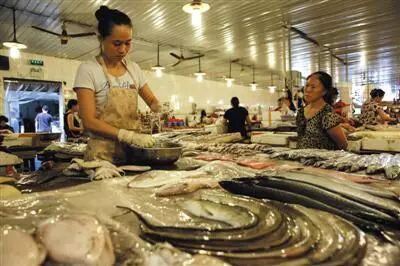 ▲相比真正致富发家的,不少“温州村”北漂一族显得平淡艰辛。7月24日,大红门南江蔬菜副食商场里,刘悦(化名)正在为顾客处理海鲜。二十多年前菜市场建立之初,刘悦的母亲就在这里租了摊位,,然而在京多年刘悦从没有看过一次升旗。