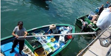 当天下午,当地鱼民上前往西贡码头出售新鲜鱼获物。而不是一个浮动的市场,这是一个更高码头,鱼民通过桶将海鲜送到街道。