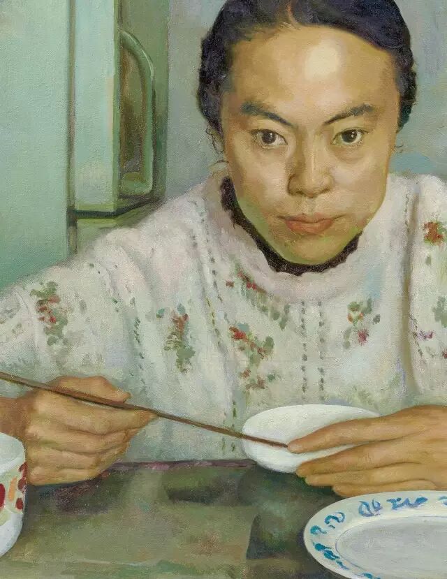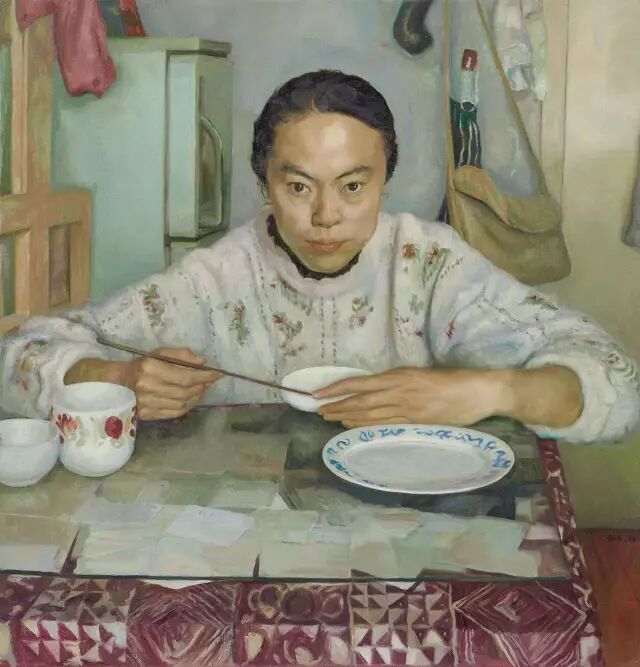 画面中朝戈家中拥窄的饭厅为九〇年代普遍中国平民百姓家中典型的陈列摆设,背景深处随意斜挂的布包一角稍稍翘起,与前景玻璃下微微露出一角的纸条巧妙呼应,构成了一种不安的视觉元素,以洞察入微具象表述细腻暗示了艺术家对于时代环境动荡不安的精神把握。而在这动荡纷乱之中,画作的主角——饭厅的女主人以双臂横向舒开、稳放于桌上之姿,毫无躲闪、直视前方之眼神,面貌端庄、神态坚定之形象,构成金字塔形般的三角构图,顿时赋予整幅画作一股定海神针般的份量感。