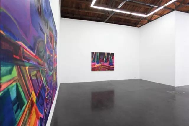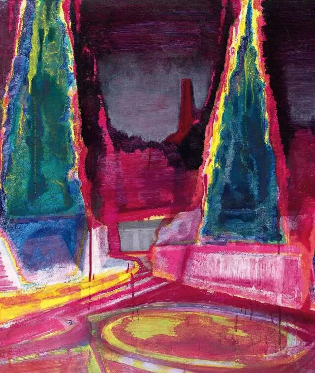 对比早期色调阴暗的作品,艺术家在此尝试用更多的饱满色彩取代过往单一的黑色,在《陷阱》中,黄宇兴以荧光颜料包裹树林,构成硕大的锥形体,通过颜色和几何切割的构图形成强大的视觉张力,重新表达个人内在对事物的观察与体验。萤黄色的涂料游走于树林、台阶、及不同建筑物表面的边缘,延续了早期「光芒」系列中对于「光」的独特描写,使色彩在艺术家笔下获得解放。画中层层迭迭如璀璨流光折射而就的缤纷,散发出犹如烟火瞬间迸发而出的生命穿透力。