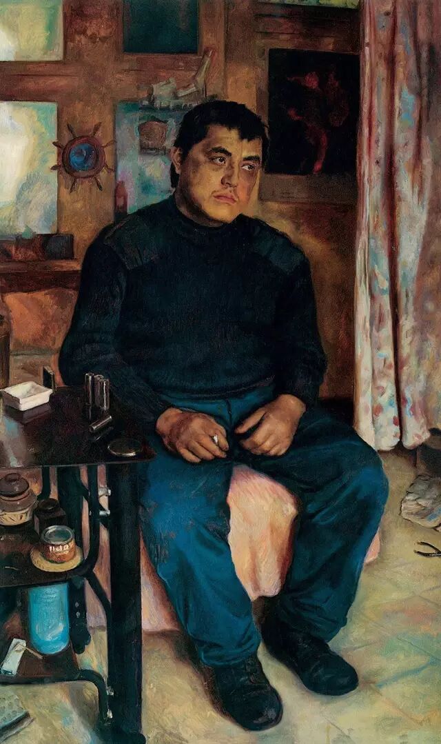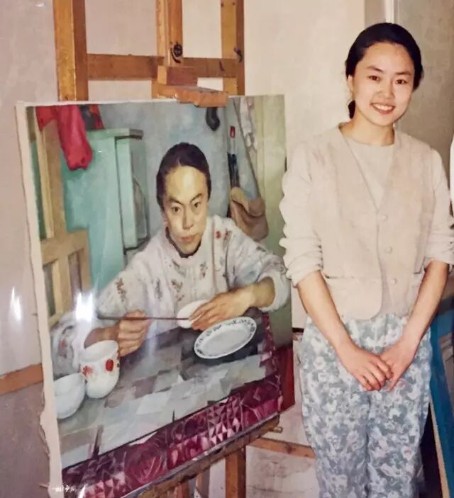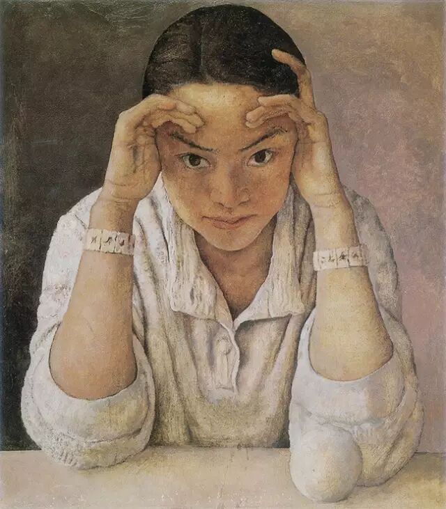1984年,朝戈曾多次回到家乡内蒙古写生,并在这过程中结识了日后的人生伴侣——他的妻子,李伟。感情的经历拓宽了朝戈的人生体验,他随后将这种内心情感的变化纪录于一组以妻子为原型的绘画作品之中,如1987年的《宝石》、《眼睛》、《红头巾》,成为其笔下最为经典的肖像代表作品。九〇年代初期,妻子的形象便鲜见于其画中,直到《桌前人物》中再次出现,所倾注的个人情感和独特意义不言而喻。