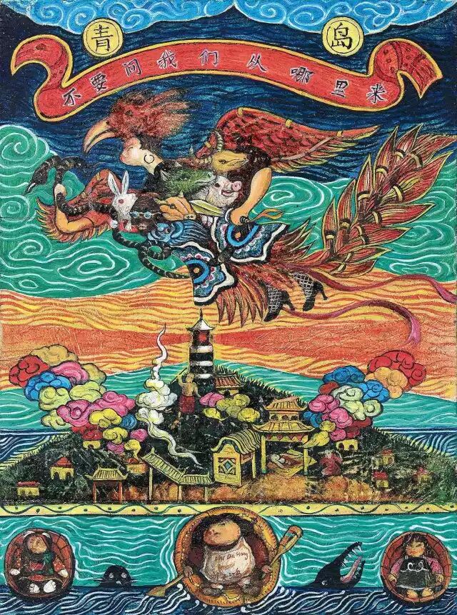 青岛作为艺术家的家乡,承载了其思想上「一方净土」的精神寄托。在作品《青岛》中,传统的牌楼、租借地的教堂,呈现一派人去楼空之景,女人代领牲畜化为凤凰逍遥翱翔在空中,彷佛摆脱了世间的枷锁,让灵魂升华。但遨游于空的大鸟何去何从,又带出了一股彷徨无力、对理想和未来迷茫的惆怅之感。
