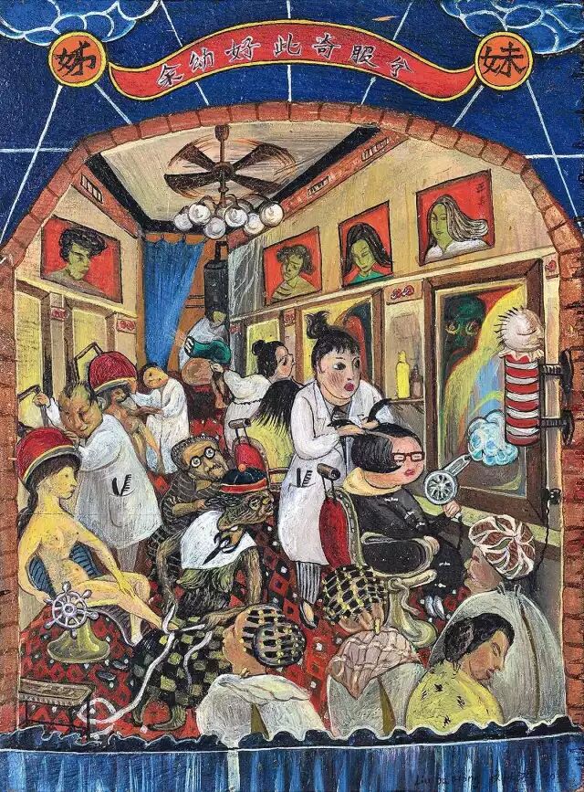 《姐妹》以美发厅为场景,构绘中国诗人屈原笔下「余幼好奇奇服兮」之诗境,借屈子对浊世的绝望,对画中各形各色的奇异发型、热闹场景投以戏谑的嘲讽。如画中右侧的女士们正在吹剪时下新潮的妆髪,旁侧却有人正剪断满清时期遗留而下的「小辫子」,或正在清理三寸金莲的裹脚布,暗喻了旧式文化在新时代里有着皇帝的新装般的滑稽感。