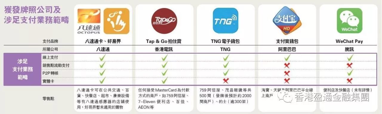 目前來說,O! ePay已經與八達通整合,而且使用有NFC功能的Android手機可以直接為八達通增值,發展潛力不俗,惟仍跳不出八達通的框框,多用來與朋友夾錢食飯為主。Tap & Go則作為MasterCard流動預付產品,吸引了不少無法申請信用卡的人使用,再掛上Android Pay、Apple Pay等作網上支付,有一定客路,而TNG,在港工作的外傭幾乎全靠此App,亦殺出了一條血路。