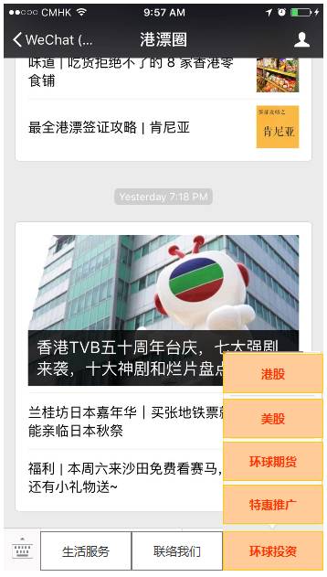 近日,直达国际与香港最大内地人士网络平台——港漂圈达成深度合作关系。港漂圈将于其官方渠道(微信、微博)发布直达国际关于环球证券、环球期货等资讯,并在其官方微信菜单栏添加环球投资栏目。
