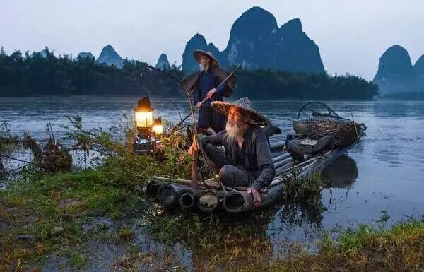 桂林山水元素一览无遗,环绕的青山、清澈的漓江,渔翁披着蓑衣,在竹筏上指挥着鸬鹚捕鱼。