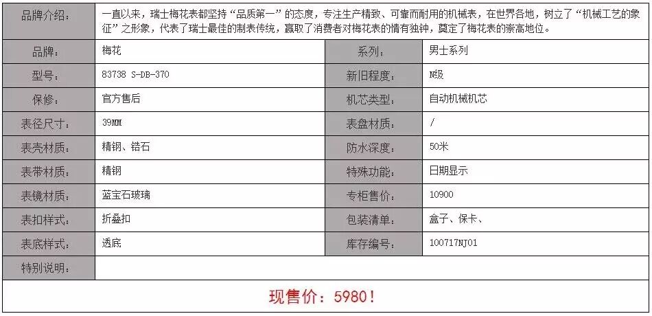 梅花男士系列钢款钻石白盘自动机械机芯表83738 S-DB-370 现售价:5980!100717NJ01