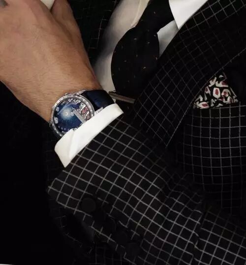 要形成手表---衬衫袖口---西装袖口三层次的效果。若是穿非素色(格纹、千鸟纹以及以及大面积印花)西装的西装,应搭配款式简单的手表(就是只有时针分针秒针组成的手表);若是着素色的西装,则可以佩带花样繁多的手表(双网眼、三网眼、陀飞轮、镂空雕刻等)。手表和西装是相辅相成的主角,而不是相冲的主角。