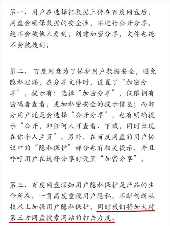 对于公开分享的文件被第三方网盘搜索抓取方面,百度网盘称,将加大对第三方网盘搜索网站的打击力度,不断创新从技术上加强用户隐私保护。