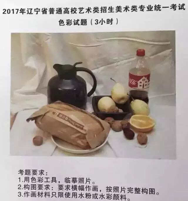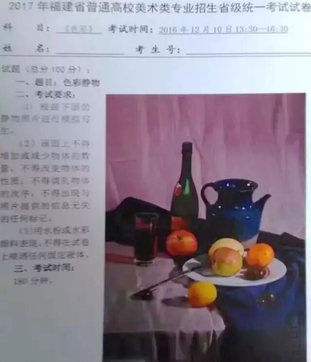 色彩考题:玻璃花瓶一个,花一束,白葡萄酒一瓶,菠萝一个,哈密瓜一个,白瓷盘一个,面包三片,水果刀一把,葡萄一串,橙子两个,苹果一个,柠檬一个,糖果一盒,衬布两块。
