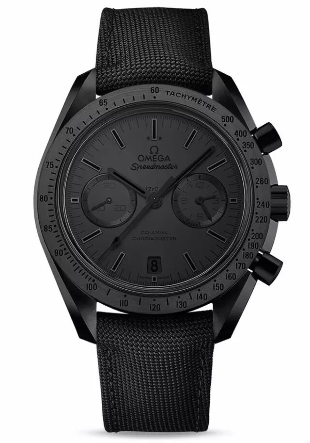 经抛光与磨砂处理的黑色陶瓷表壳和哑光黑色陶瓷表盘,搭配黑色涂层尼龙织带及黑色陶瓷表扣。磨砂指针和刻度均经黑化处理并覆以极为少见的黑色夜光涂层,就连黑色陶瓷表圈上的测速刻度也采用了黑色喷漆。真正不负“月之暗面”与“墨黑”之名。