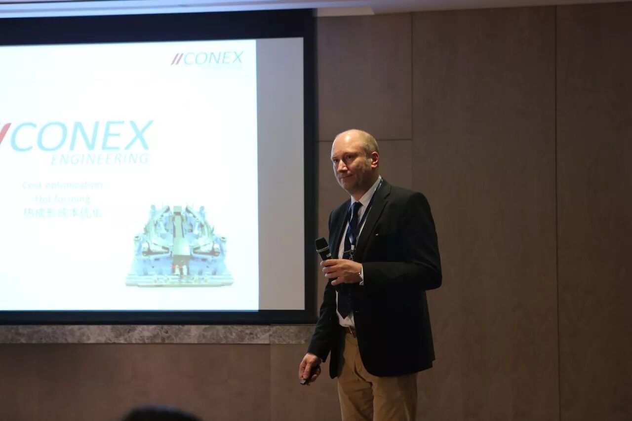 随后CONEX首席执行官 Mr.Jan Larsson 做了题为《多腔热成形模具,挑战和可能性》和《热冲压工艺成本优化和可行性》的技术报告。就CONEX历史发展、自动化上下料系统、软模、量产模具系统、模具中的控制系统、模具上的相关传感器、模具材料及模具成本方面进行了详细的讲解。