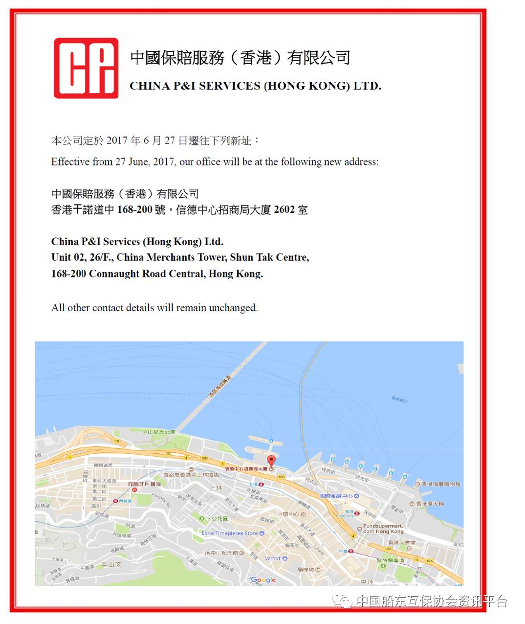 6月27日,中国保赔服务(香港)有限公司在香港信德中心招商局大厦26楼举行乔迁新址仪式。协会董事、海宏轮船(香港)有限公司董事总经理张保良先生,在港会员、行业代表等参加了仪式。仪式由公司董事总经理孟祥伟先生主持。