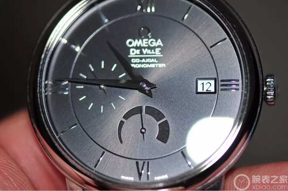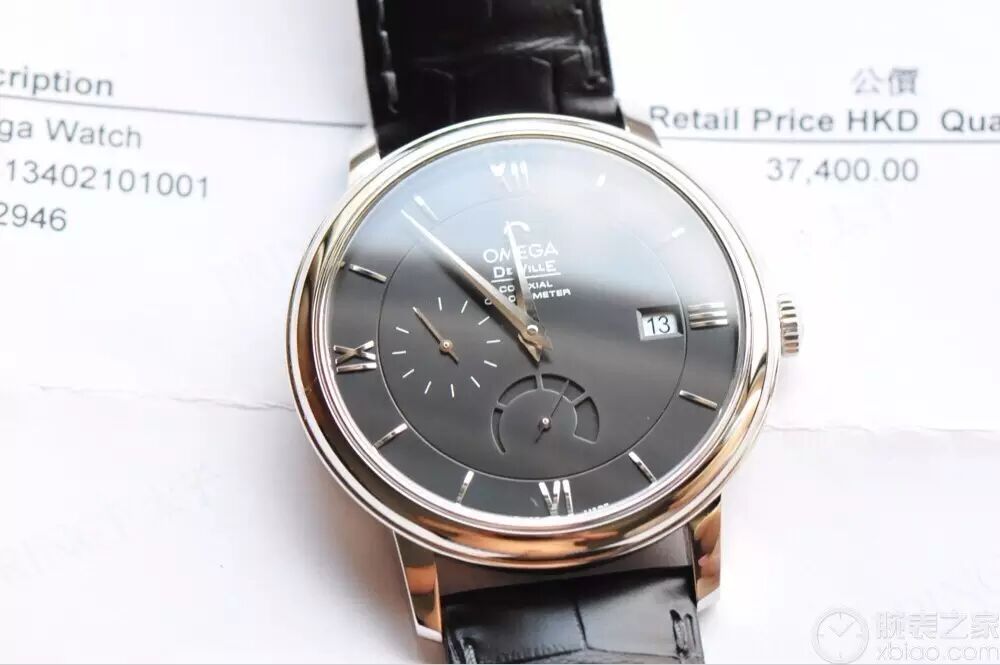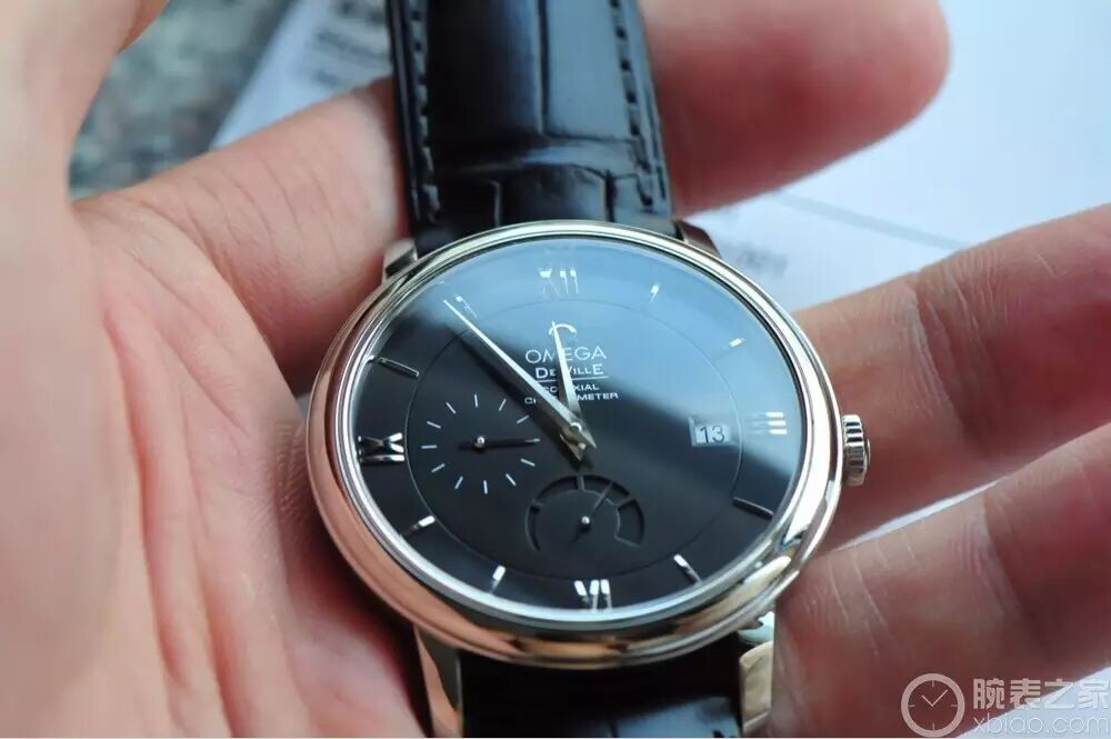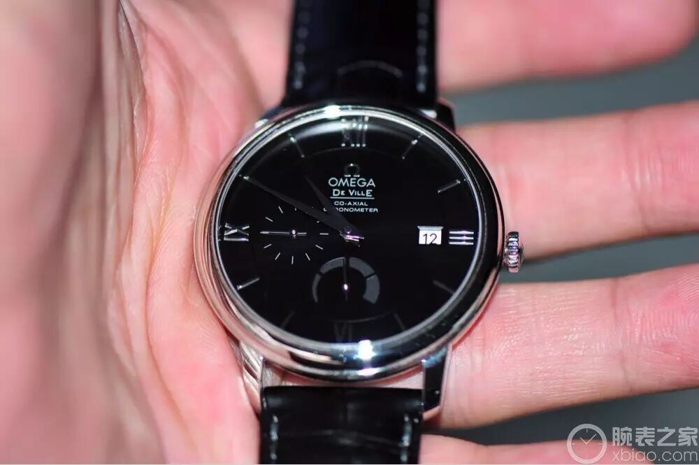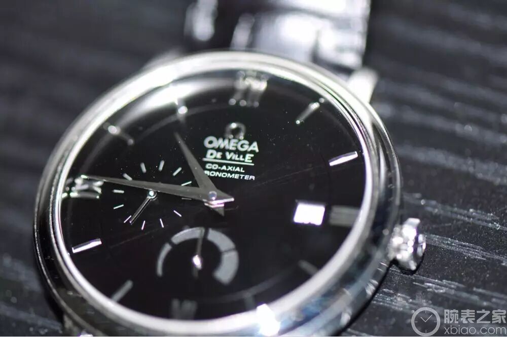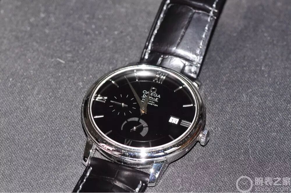这款欧米茄蝶飞不太常见,这款比较独特,三点钟位置设有日期显示,六点钟位置是动力储备显示,九点钟位置是小秒盘,都是黑色的,非常经典。