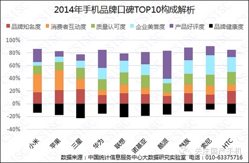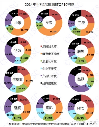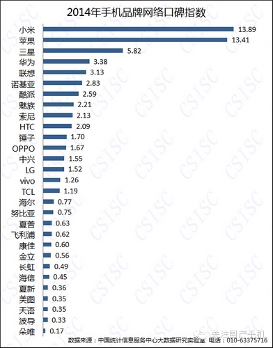 中国统计信息服务中心(CSISC)联合新华网、中国质量新闻网5日发布《2014年中国手机品牌口碑报告》(以下简称《报告》)。该报告数据来源于国家统计局中国统计信息服务中心大数据研究实验室,是在采集293个品牌中,根据声量筛选出29个比较活跃的品牌作为监测研究对象而产生的。