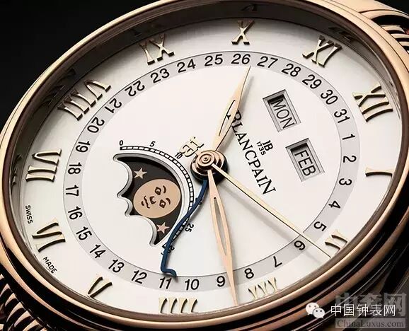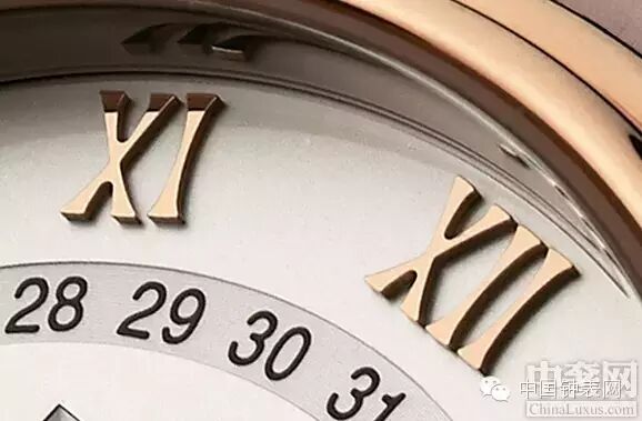 表盘上由外向内来看,品牌独有的罗马刻度时标绝非简单的印制,其光滑的抛光打磨、贵金属材质的厚重质感、中间收腰设计,令造型立体有致,熠熠生辉。日历圈略低于表盘其他部位,形成微微下陷的间层,同样,月份与星期视窗亦采用渐进式下陷的方式,为制表师增加了技术难度,却令视觉上更富层次与质感。