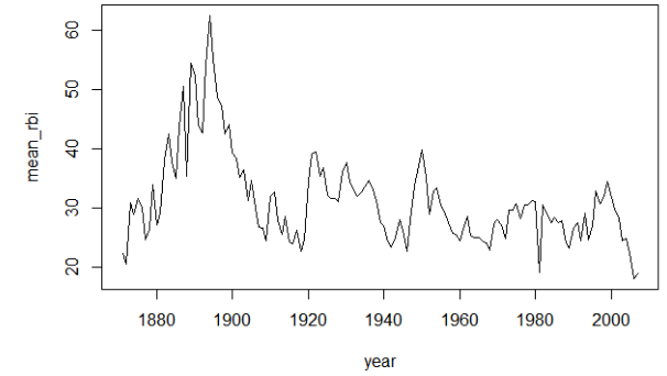 rbi <- ddply(baseball, .(year), summarise, mean_rbi = mean(rbi, na.rm = TRUE))