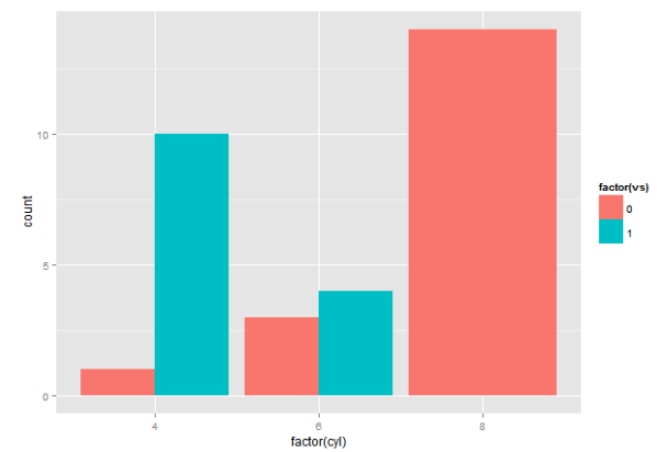 g<-ggplot(mtcars, aes(x=factor(cyl), fill=factor(vs)))