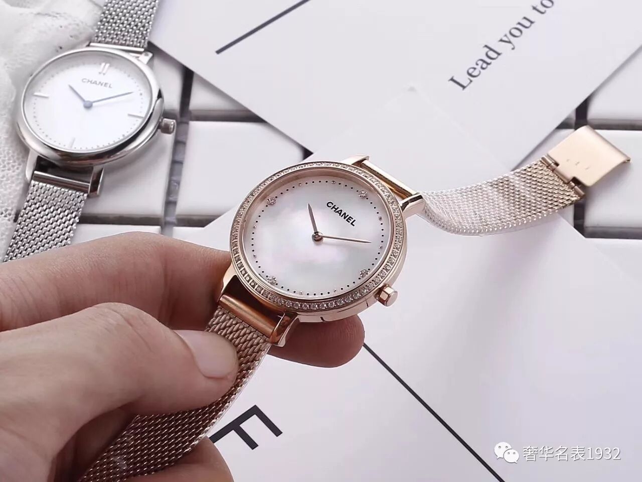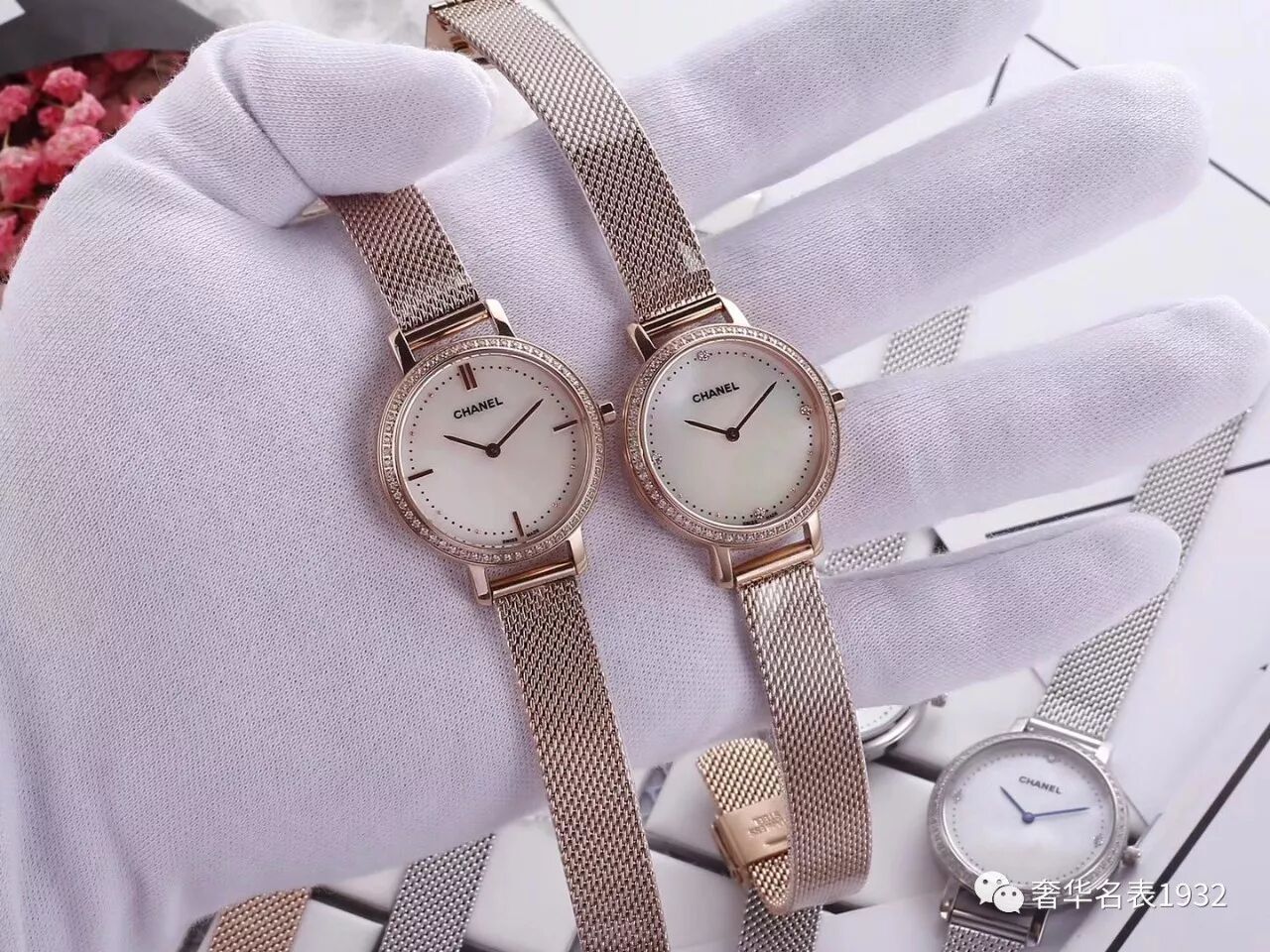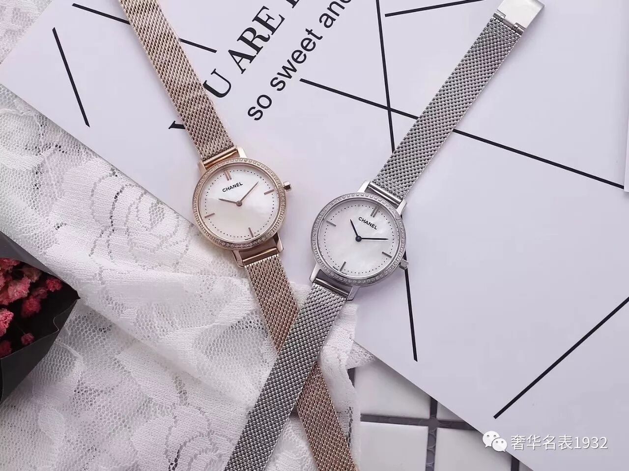让所有的目光与托付赋于一表---香奈儿极致优雅女表 分秒雕琢,玲珑之美!瑞士石英机芯 蓝宝石镜面 316纯精胚特制钢壳 31mm小巧表盘 简约温婉 珍珠贝母镶钻 气质绝尘 米兰尼斯编织钢带 风格细腻 ! 月有圆缺,只愿你时光不朽,不迎合,不逐流!