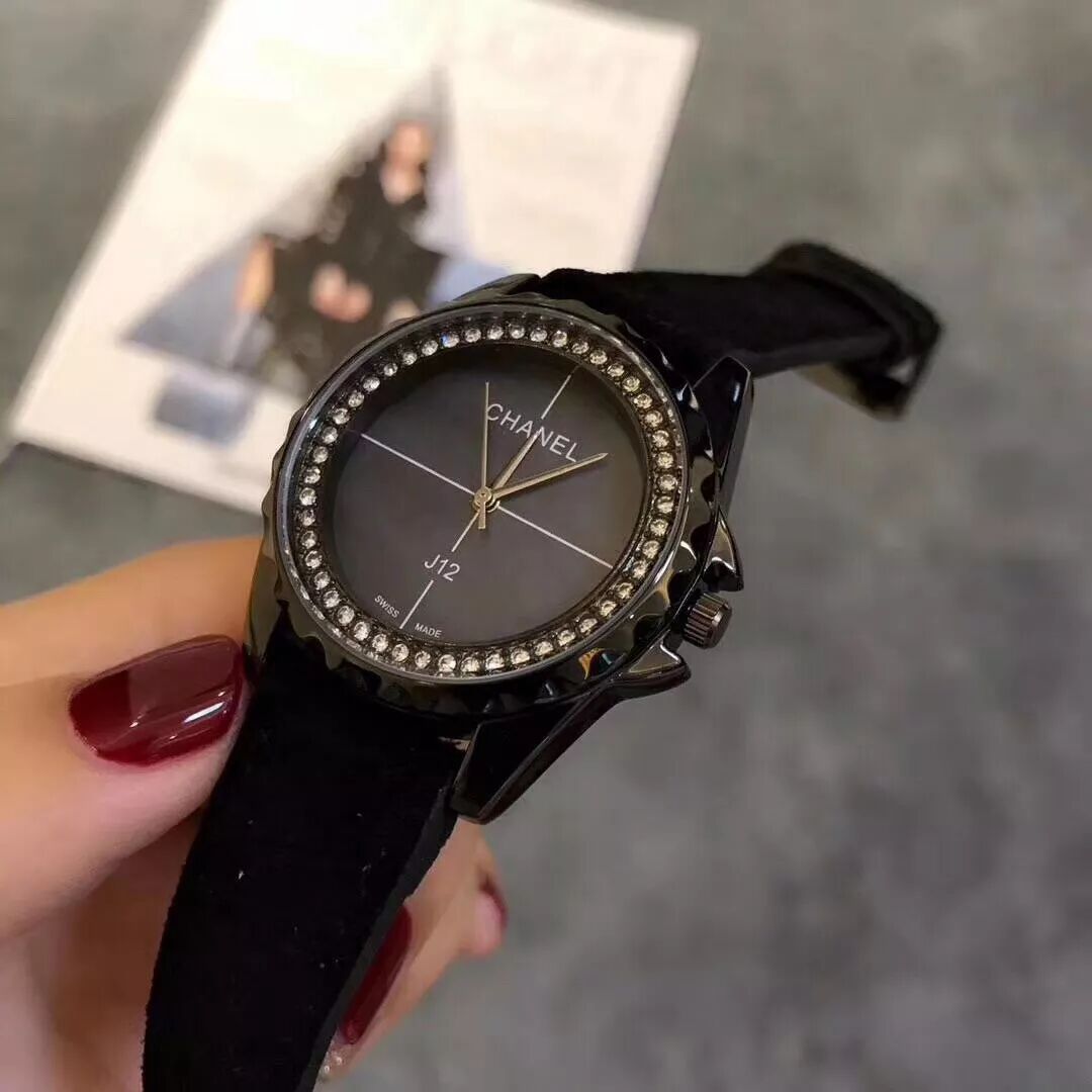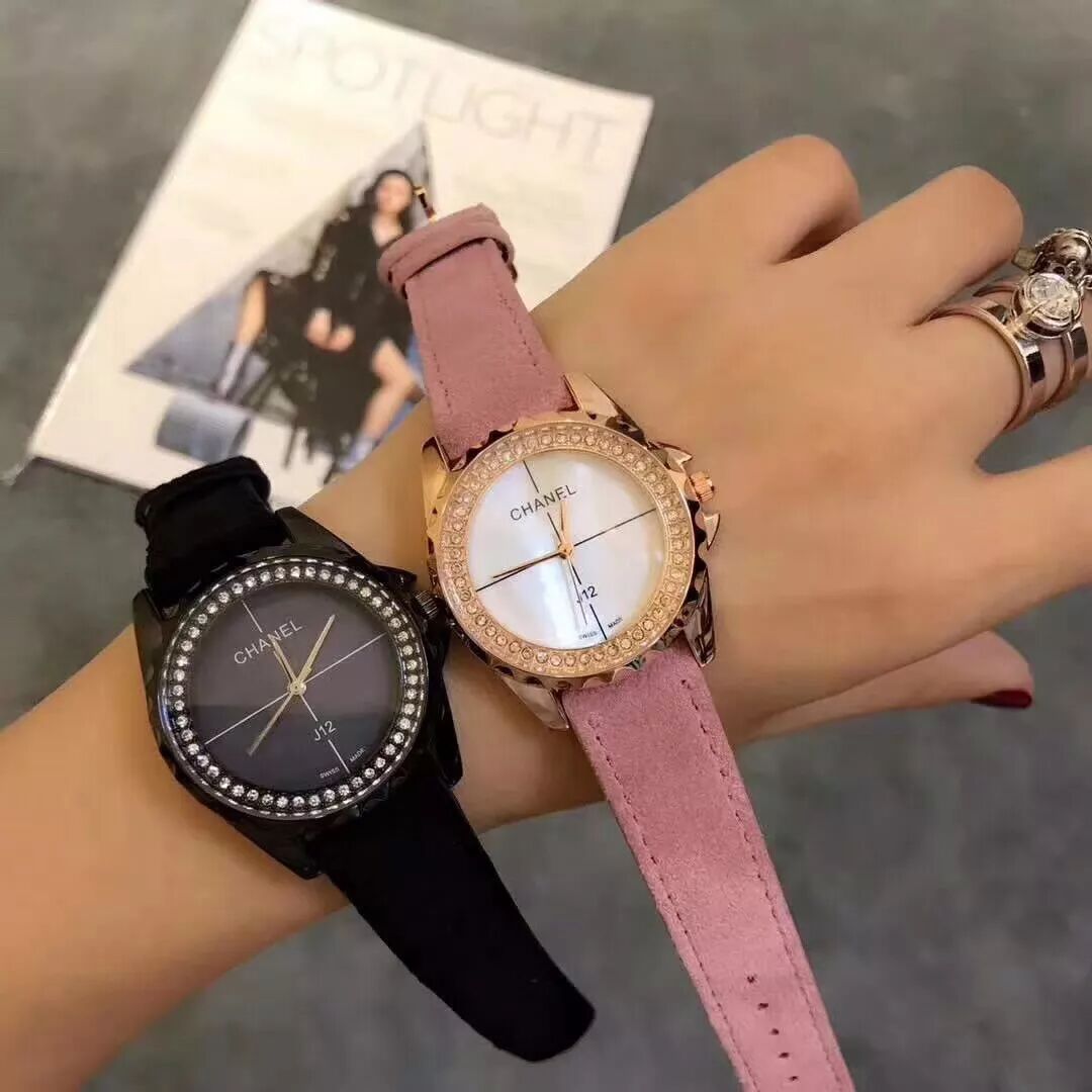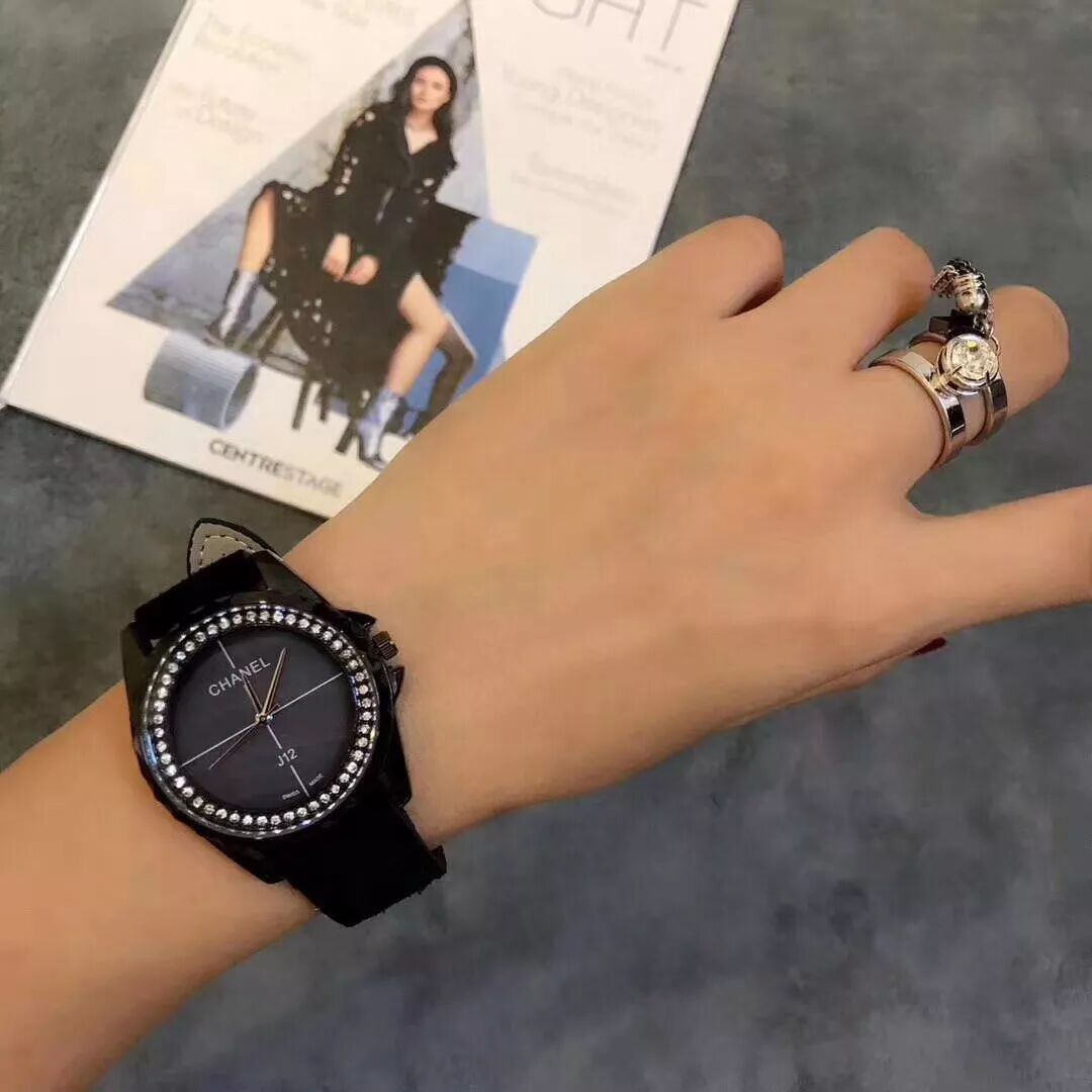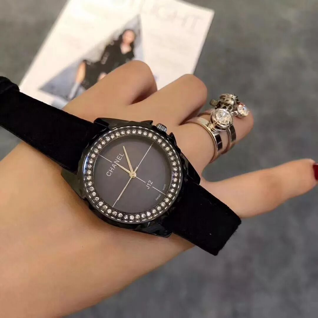 特价¥90 所有包装小票齐全 独家新款到货香奈儿J12 系列,此款产品跨越了传统概念的"时尚",现代年轻,简柔优雅,充分的体现品牌精神,进口石英机,珍珠贝母面,鹿茸真皮带,防水品质!2个颜色尺寸37*10mm